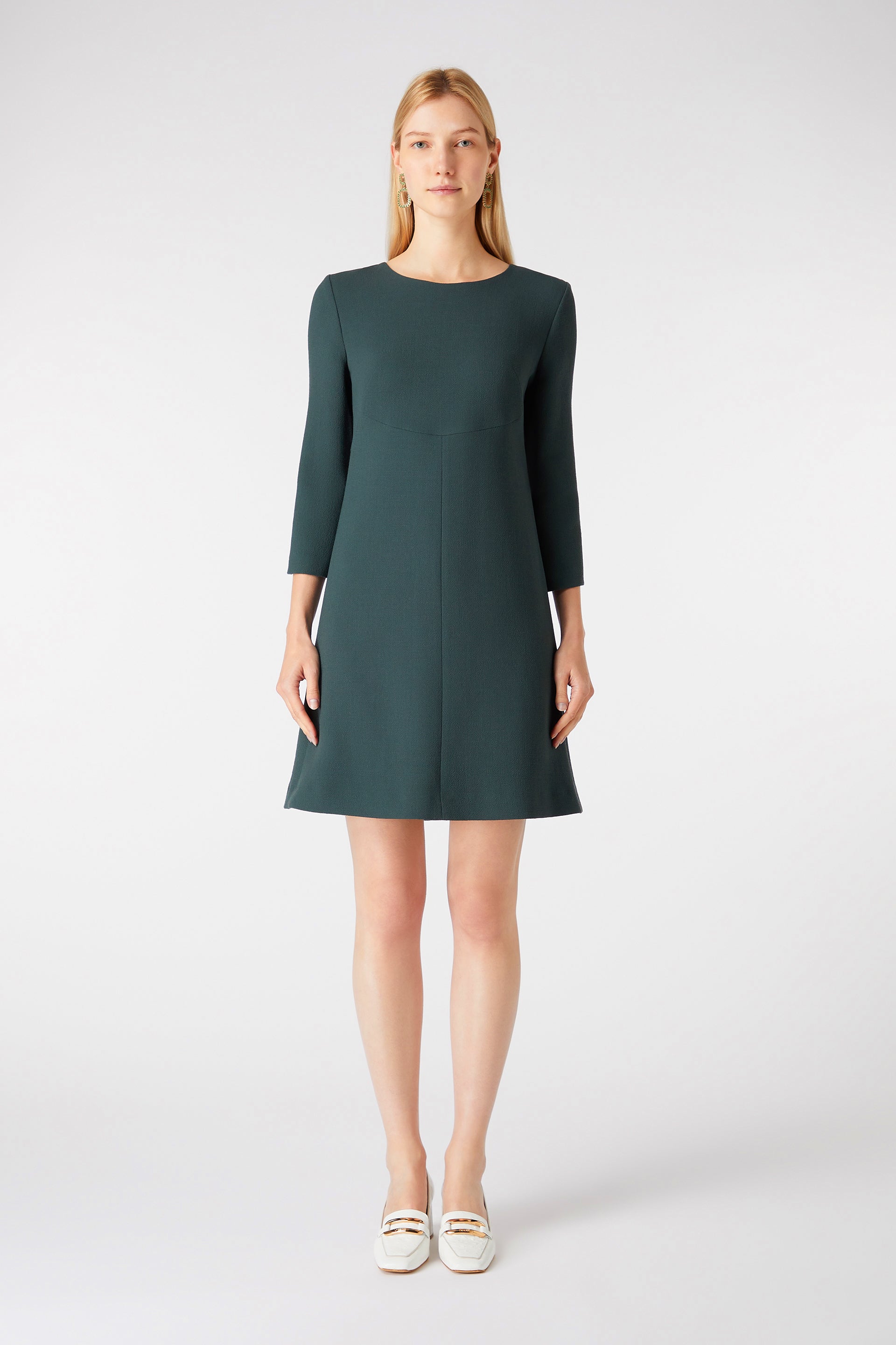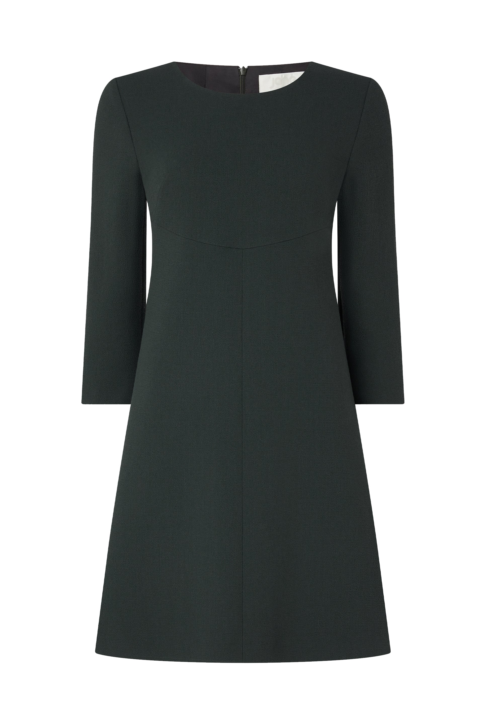 - A simple shift dress in marine is elevated with a vintage inspired curve under the bust seam.
