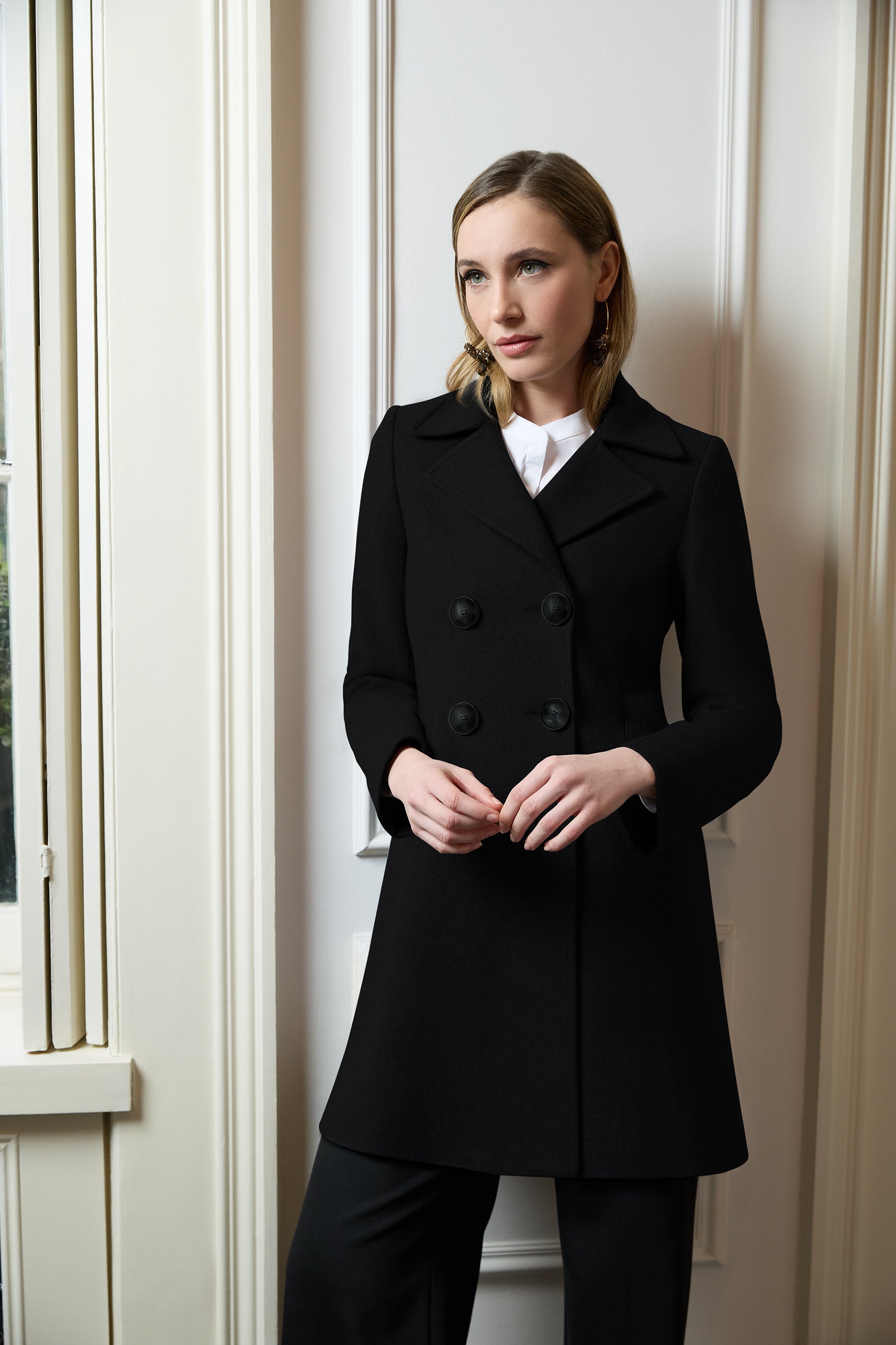 A double breasted coat with topstitch detailing along the collar, back seams, and a back belt for a shaped silhouette.