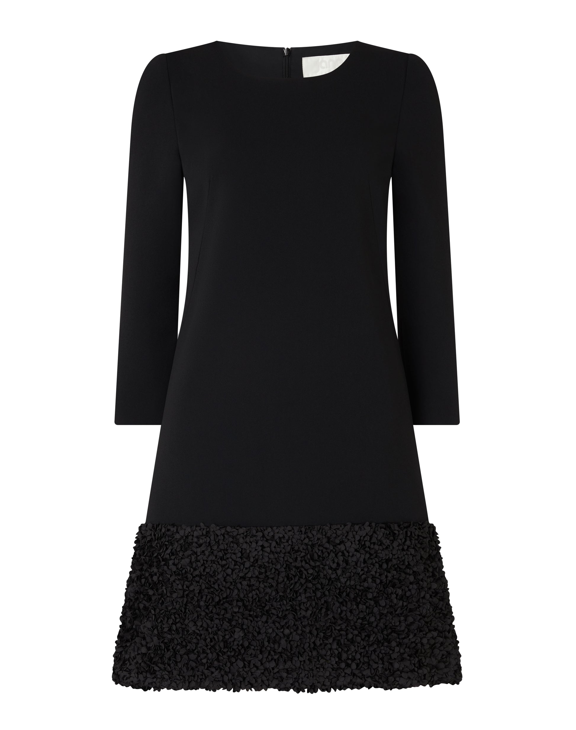 - A classic, beautifully made black tunic dress elevated with a contrast micro-petal hem band.
