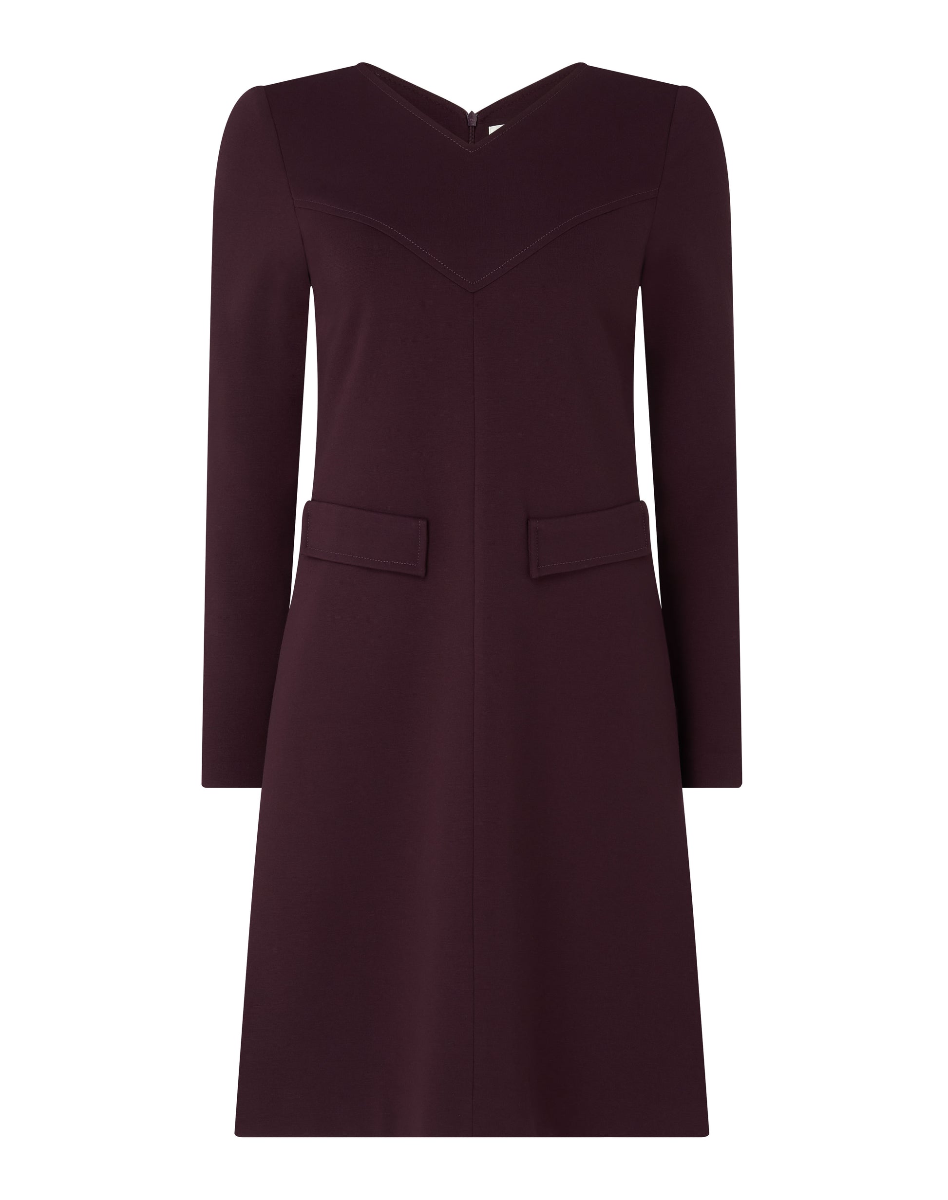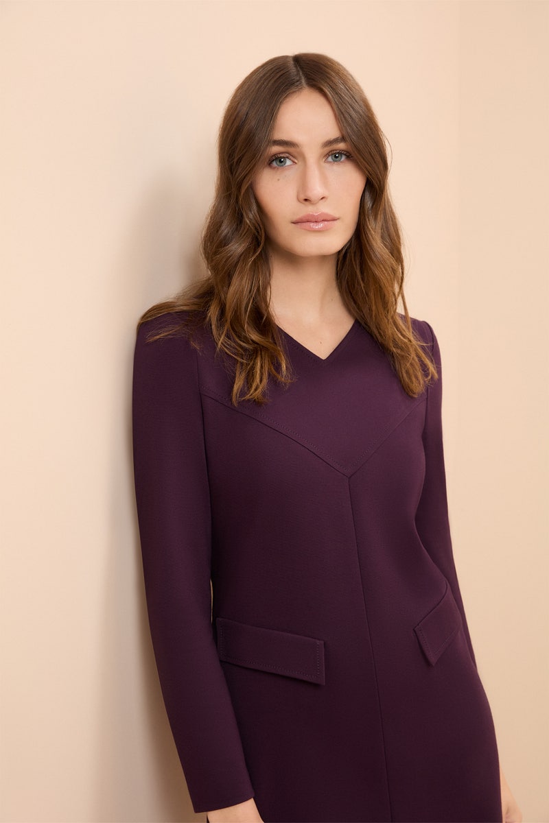 - A semi fitted tunic dress in rich, dark purple with a V-neck and a V shaped front yoke. With cosmetic flap pockets and top stitch detail throughout.