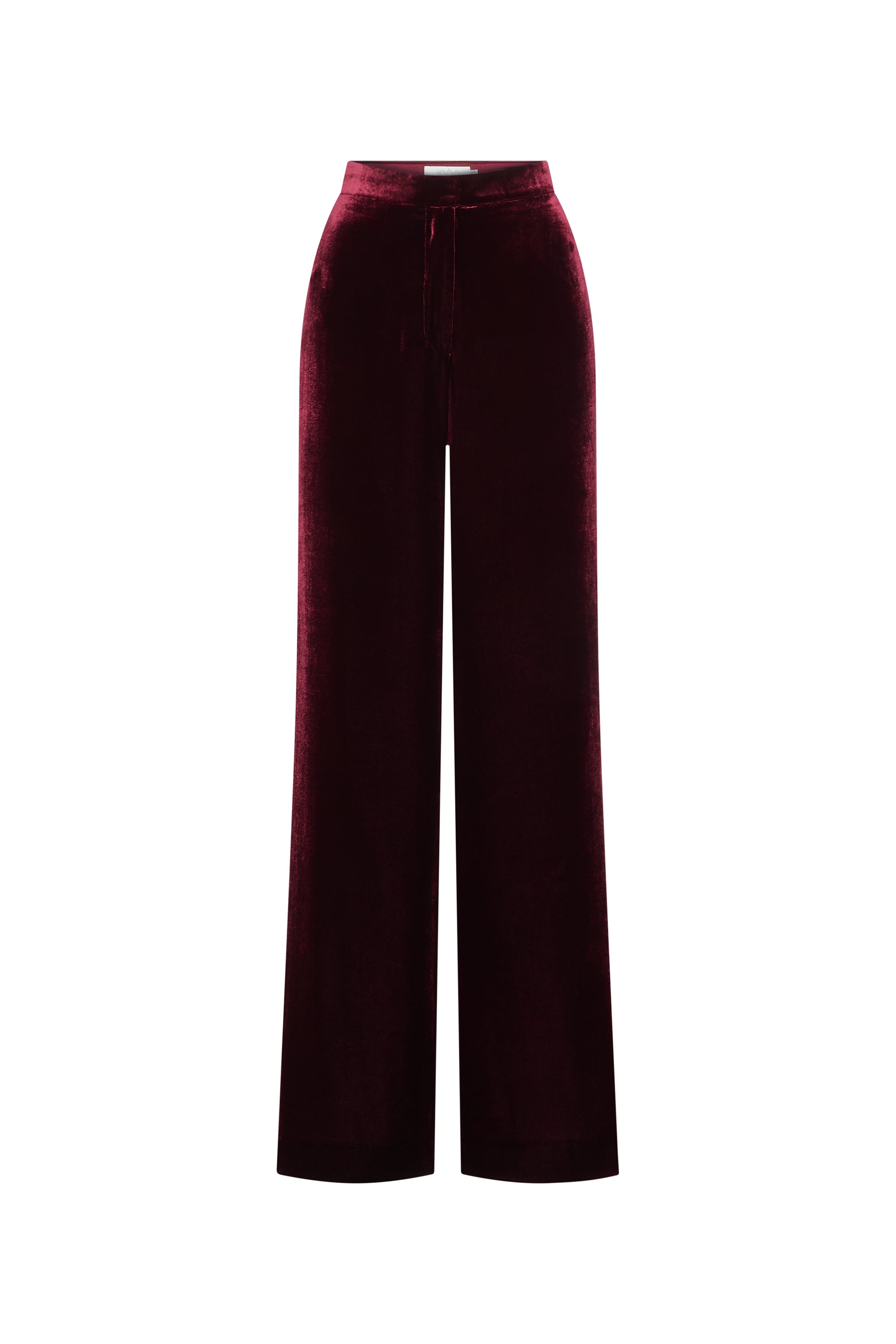- Beautifully cut, high rise, wide leg trousers made from sumptuous fluid velvet in burgundy.