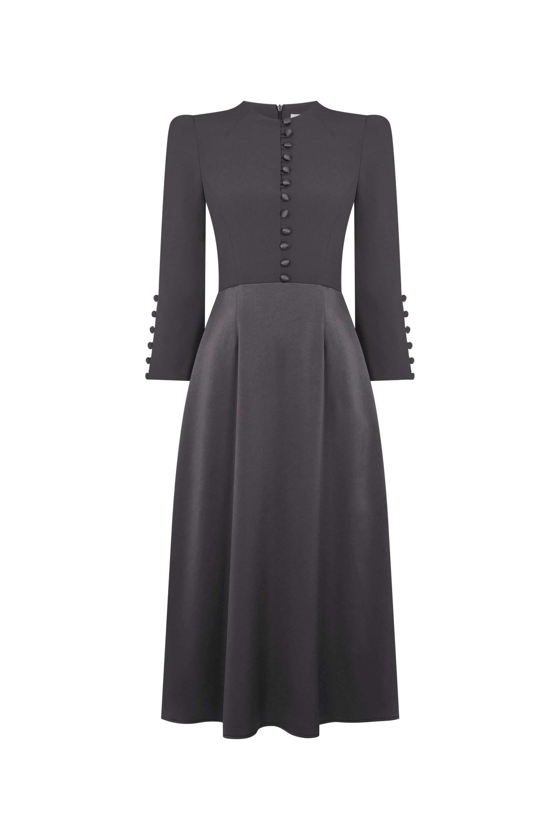 - A sophisticated fit-and-flare dress made from luxury grey cady and carefully designed with expertly placed shoulder pads, a fitted bodice and a fluid satin skirt.