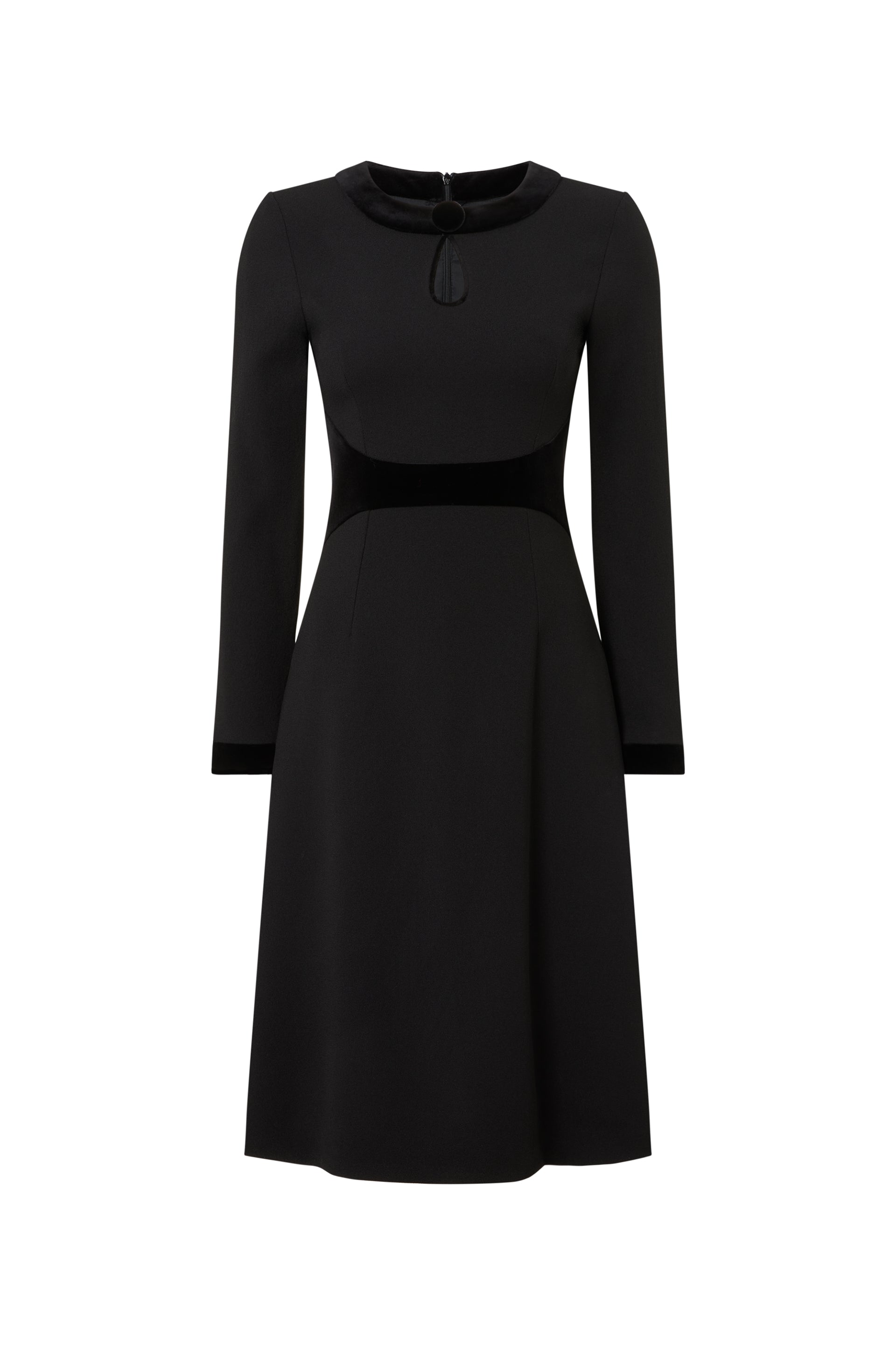 - An elegant fit-and-flare dress made in London from luxury wool crepe in black and finished with a colour matched sumptuous velvet neckline, waistband and cuffs.