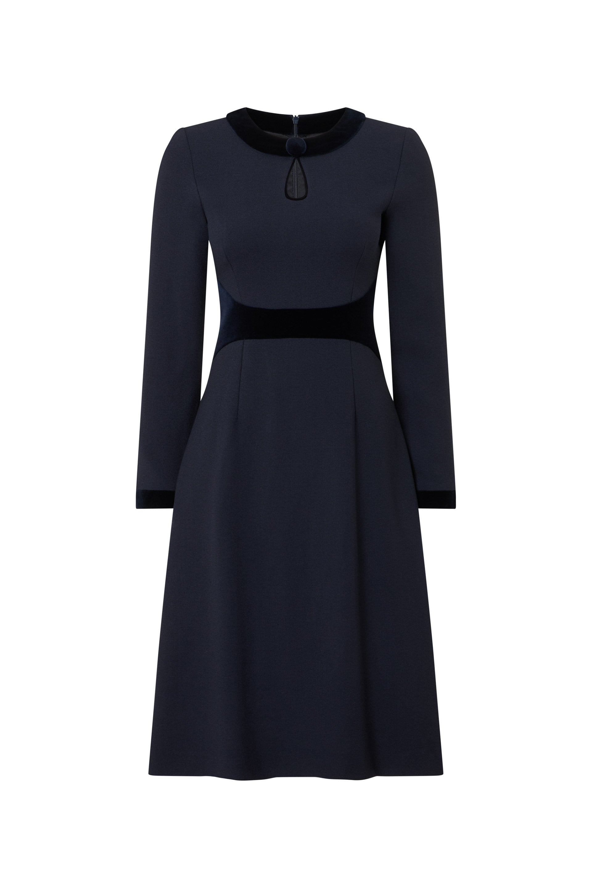 - An elegant fit-and-flare dress made in London from luxury wool crepe and finished with a colour matched sumptuous velvet neckline, waistband and cuffs.