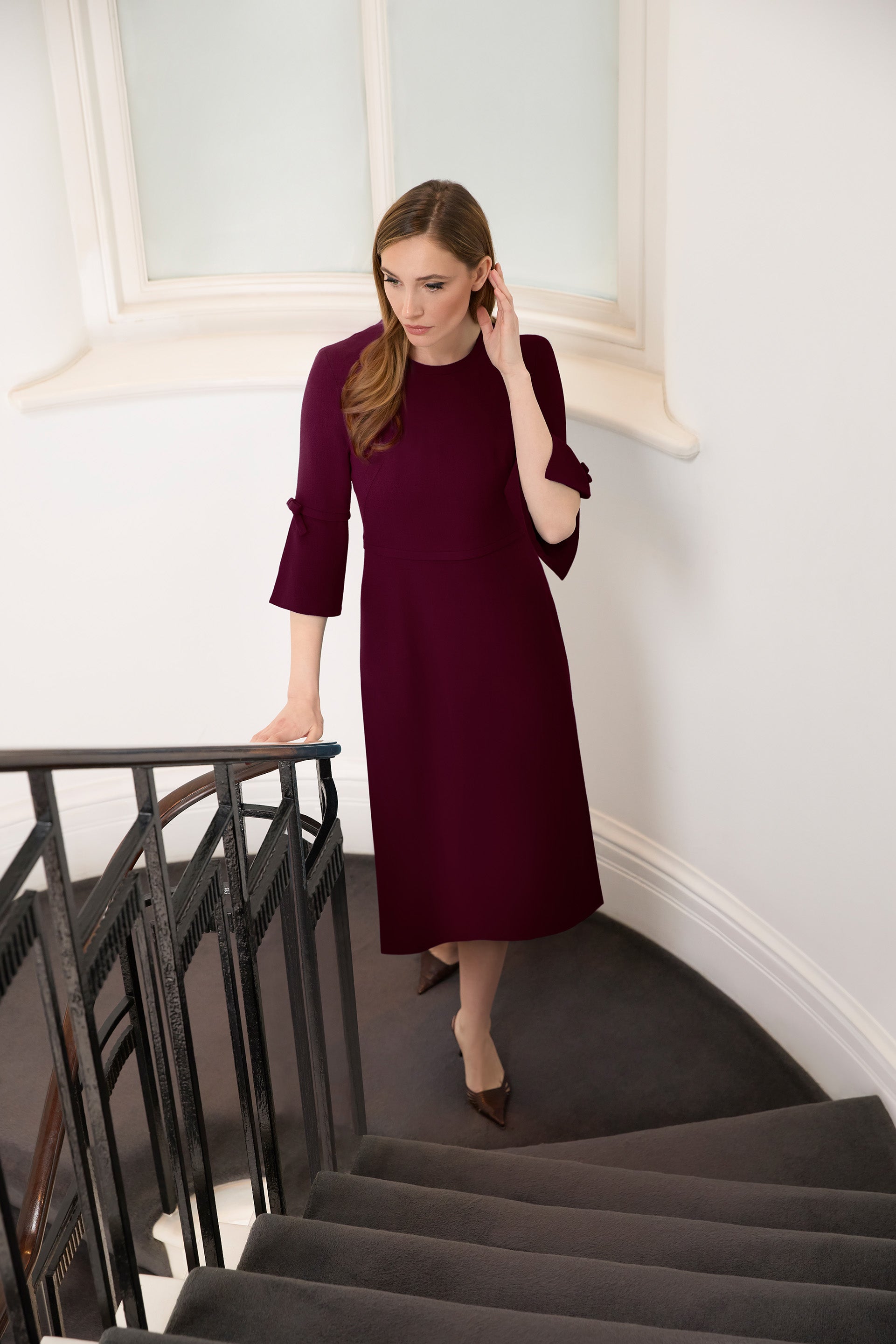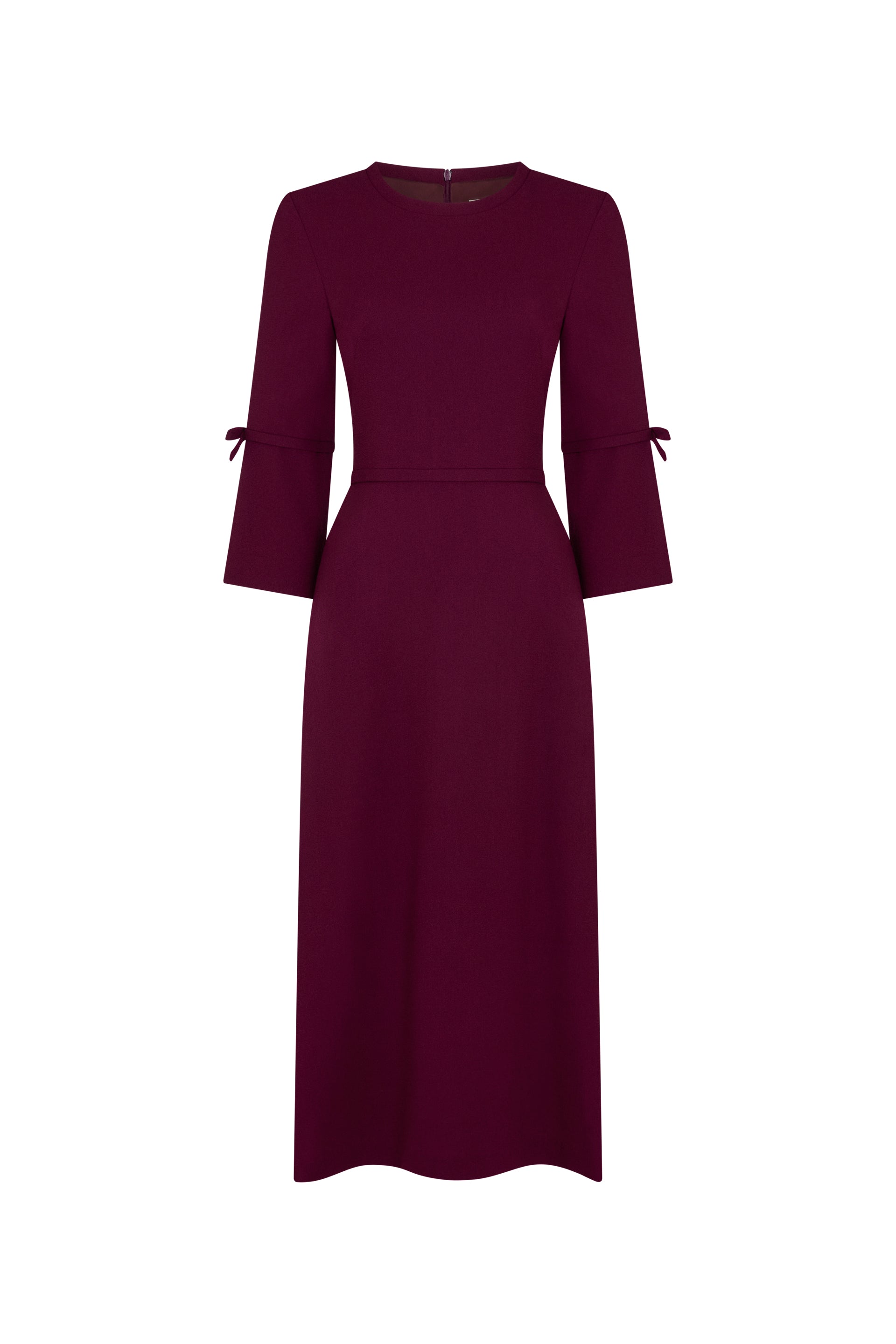 - A fabulously shaped fit-and-flare midi dress made from luxury Italian wool crepe in bordeaux - a deep red with a hint of purple.