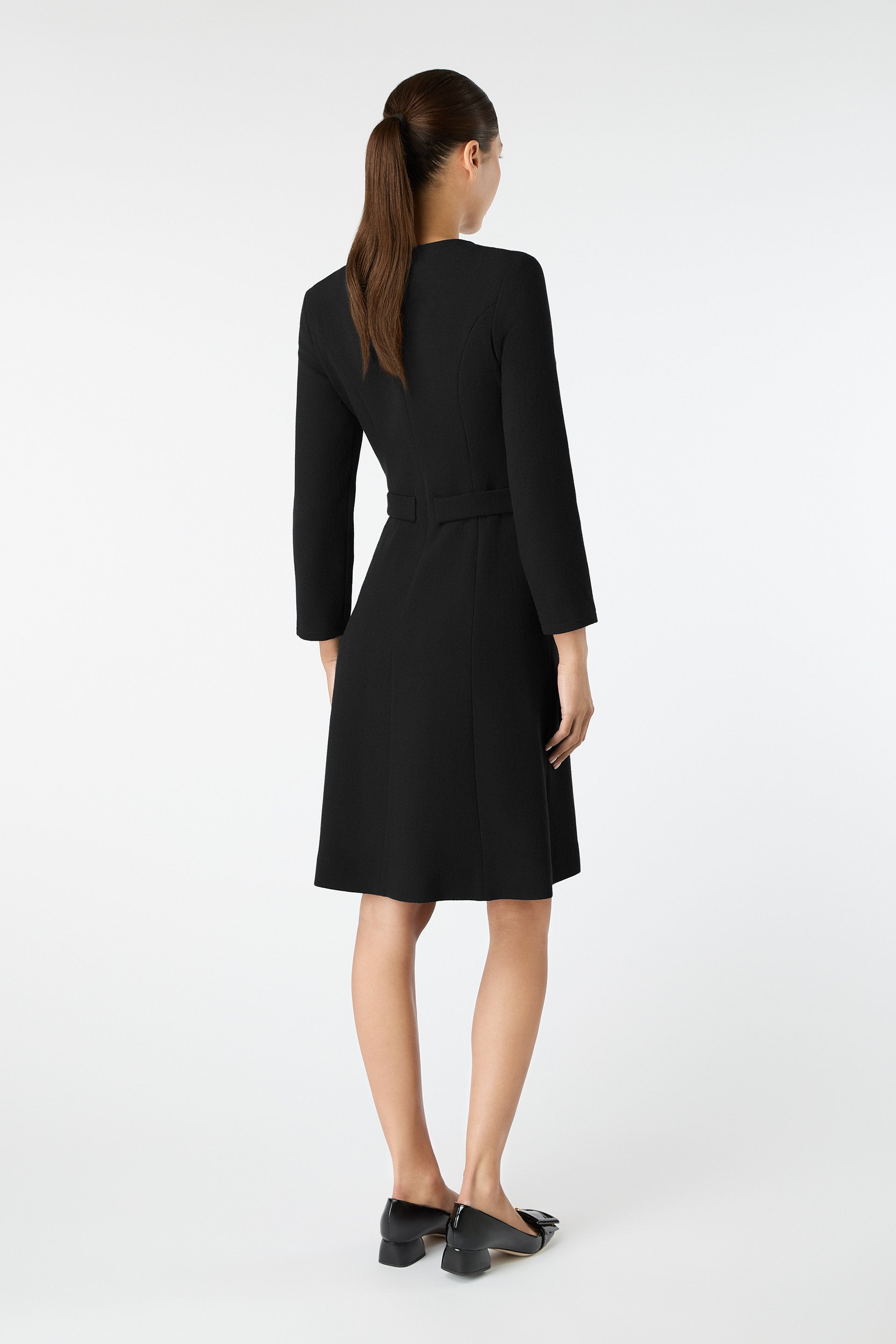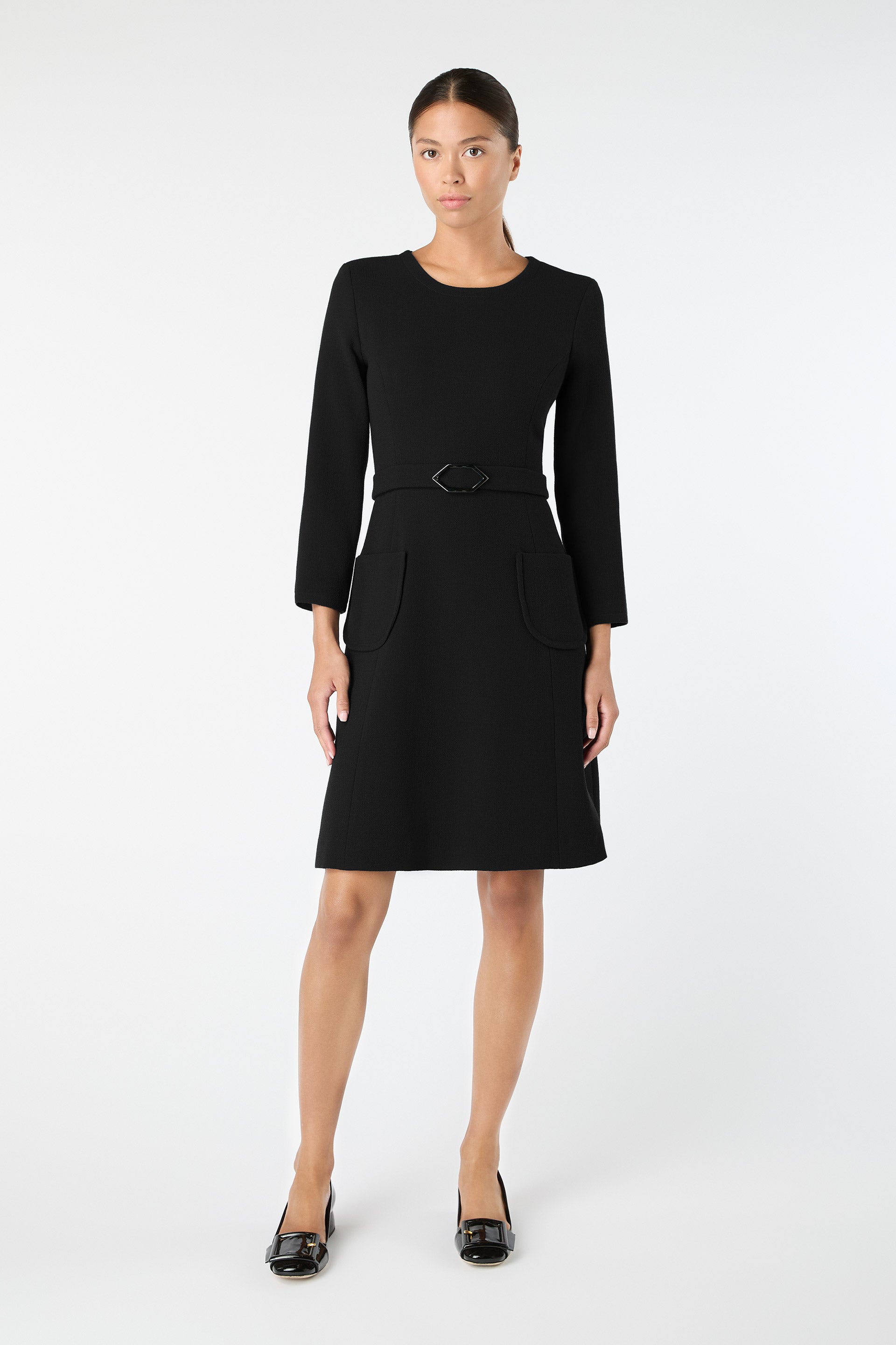 - A shift dress with vintage 1960's styling made from luxury Italian wool crepe in classic black. Designed with rounded patched pockets and finished with an attached belt and metal pointed buckle.