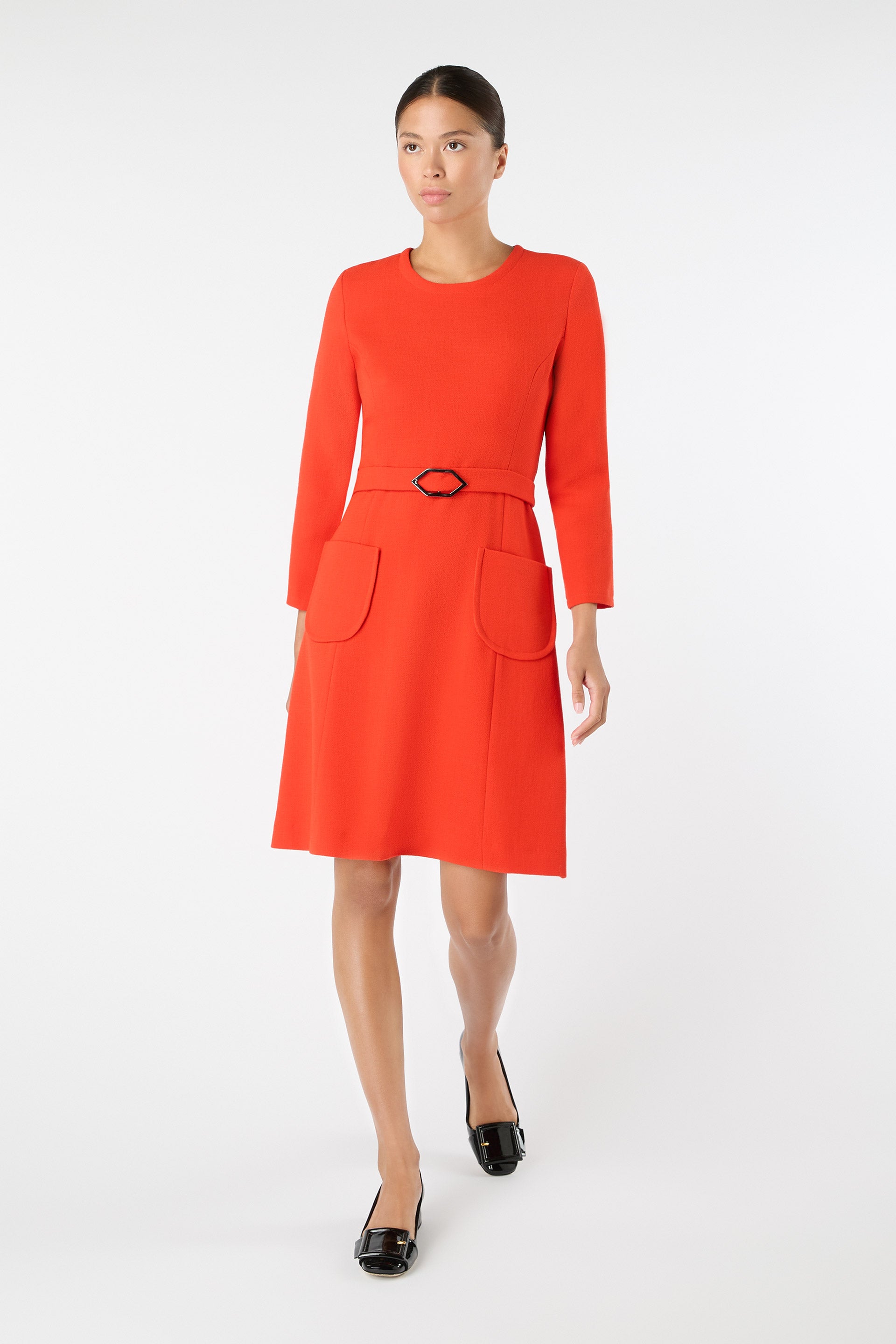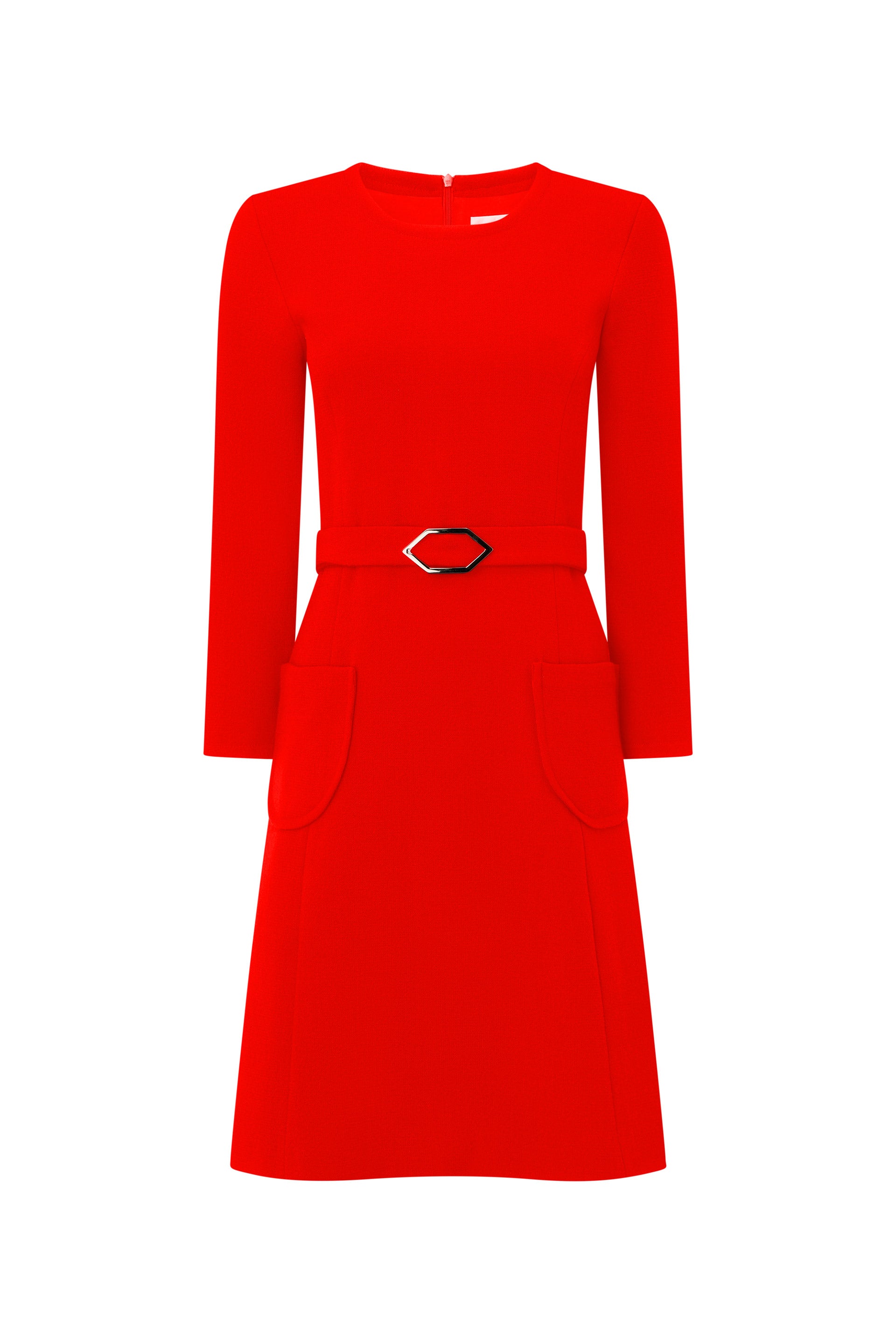 - A shift dress with vintage 1960's styling made from luxury Italian wool crepe in red. Designed with rounded patched pockets and finished with an attached belt and metal pointed buckle.
